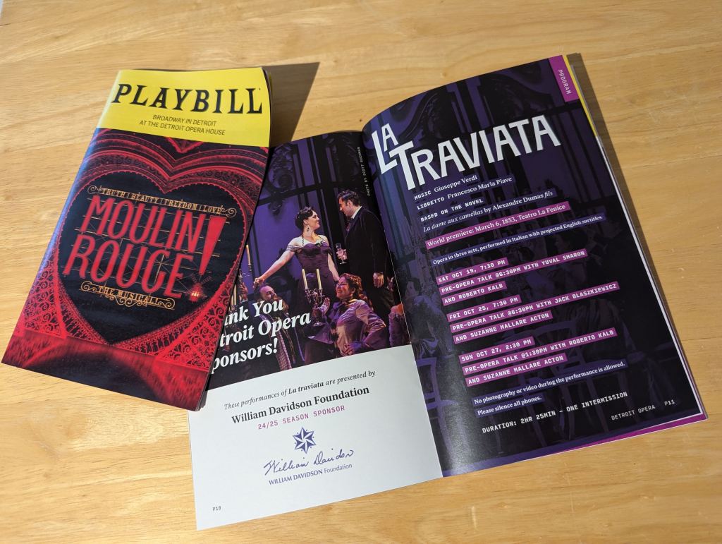 I was caught off-guard in the most wonderful way to discover that my favorite keys player was booked for our company party at Sexy Steak in Detroit. Get thee to a Jarrod Champion event if you can. It’s a real treat. The amazing songwriting stylings of Steve Taylor, Annie Bacon, and Tom Alter at the new Alpino Detroit. A pricier menu than my norm, but good listening room vibes and fun excuse to splurge a bit.Another Tom Alter gig, this one just down the road from me at Apothecary Espresso and Coffee.Checked out a second stage theatre, Grosse Pointe Theatre, thanks to one of my former cast members directing one of their dream shows. There was a display out front where you could add the name of someone you’ve lost (the show centers around a family grieving the loss of a child). It was a small healing moment to pin Dad’s name up with the rest.This blog is public so I’m refraining from posting photos of the fam without their consent — but we had box seats to Moulin Rouge at the start of the month, then Child #1 and I had second row seats to the opera upon which Moulin Rouge was based. Highly recommend the double-feature approach — it revealed some fun nuances in both pieces that we wouldn’t otherwise have noticed.